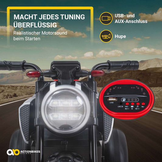 Kindermotorrad Cruiserbike, Motorsound, Bremsautomatik, 36 Watt, 2x 6 Volt, Hartplastikreifen, LED