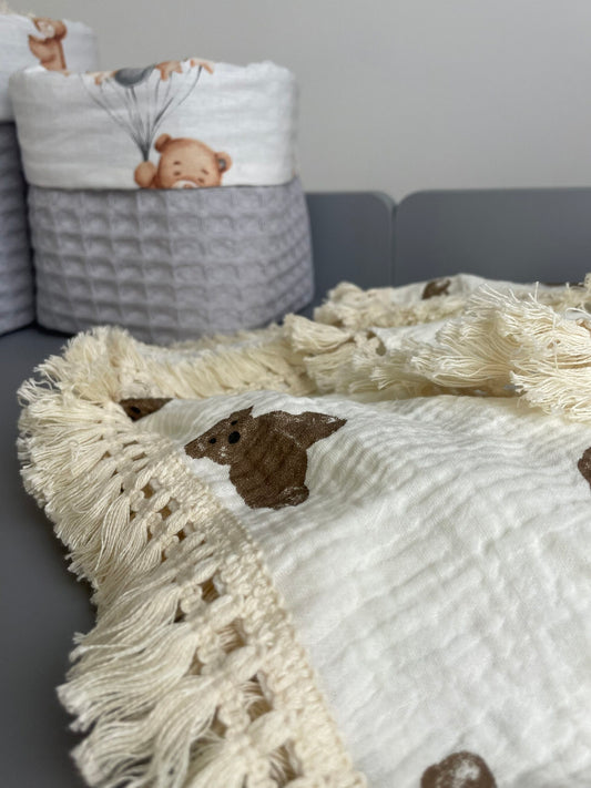 Weiß kariert mit weißen Pompons und weißer Baumwolle