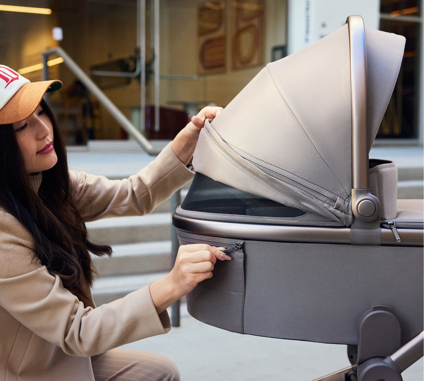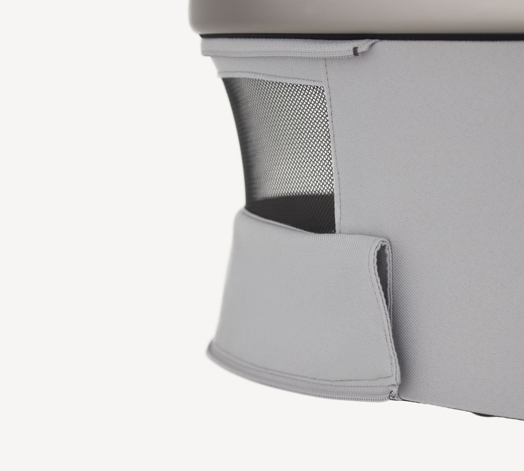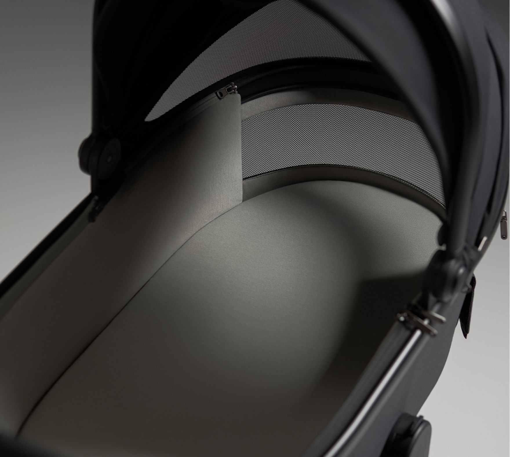 Der Kinderwagen verfügt über ein ausgeklügeltes Belüftungssystem, das für eine optimale Belüftung an allen relevanten Stellen sorgt – von der Haube und dem vorderen Teil der Babywanne bis hin zur Fußstütze und der Haube der Sitzeinheit.
