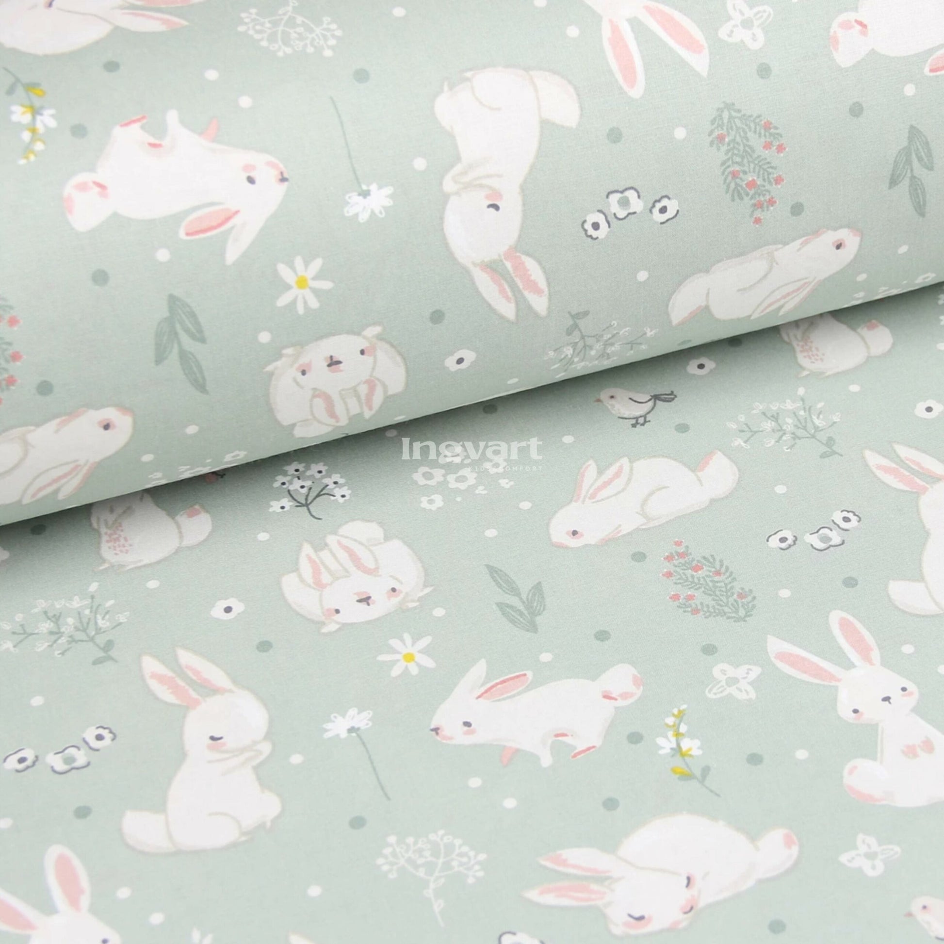 Baumwolllaken mit Hasenmotiv auf mintgrünem Hintergrund