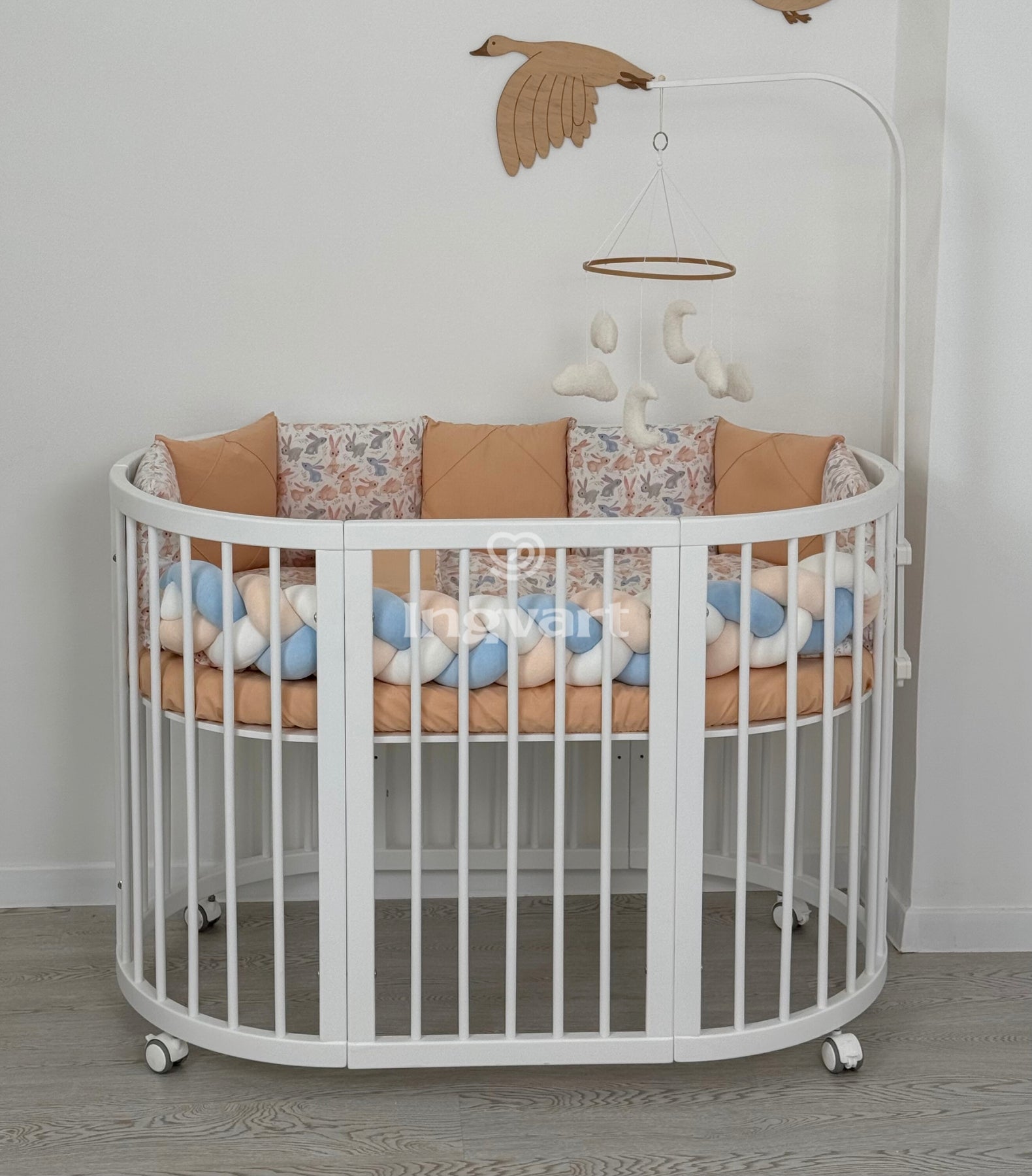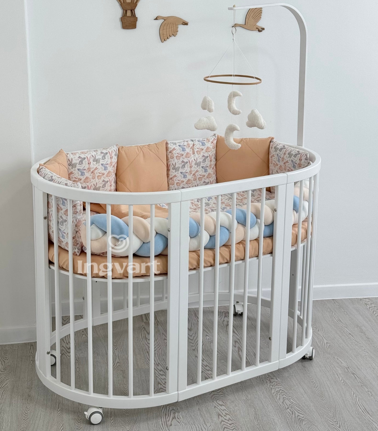 – 8 Seitenkissen 30x30 cm mit Reißverschlüssen ±2 cm, separate Bänder zum Befestigen am Bett (Kissen haben Schlaufen an den Ecken zum Einfädeln der Bänder)