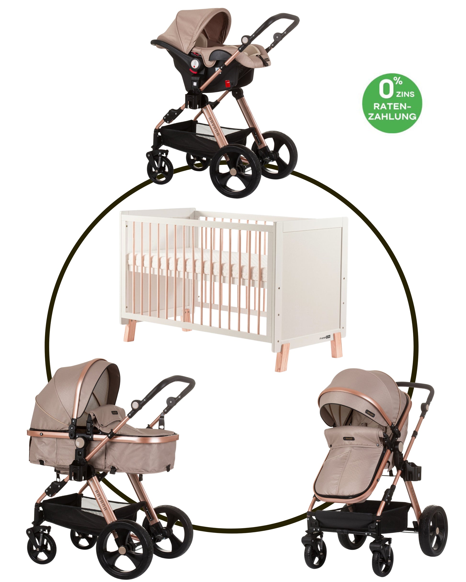 BUNDLE SET NUMMER 3: 3-in-1 Kinderwagen „HAVANA BEIGE“ + BABYBETT AVA 120cm X 60cm inkl. Matratze