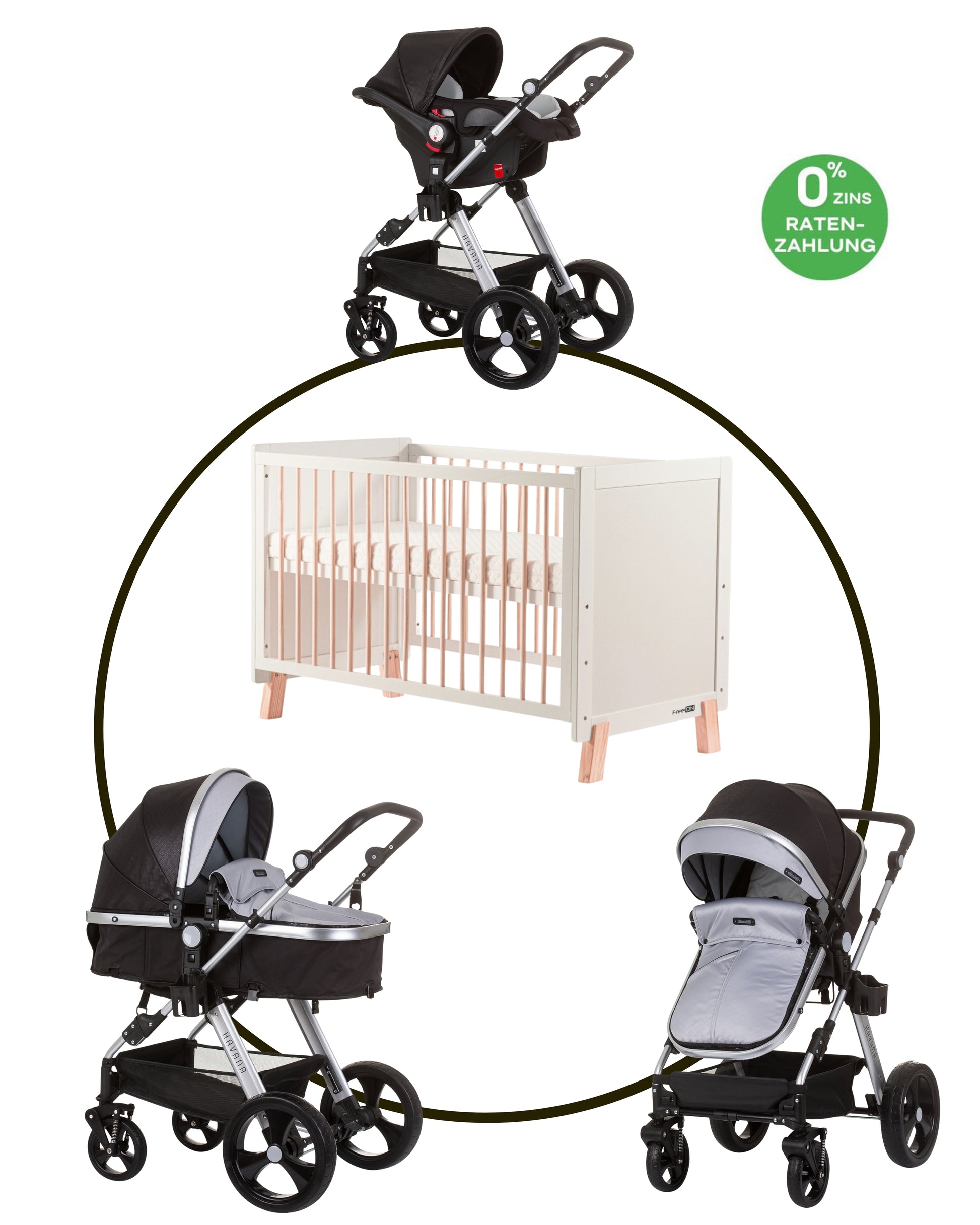 BUNDLE SET NUMMER 6: 3-in-1 Kinderwagen „HAVANA DARK GREY“ + BABYBETT AVA 120cm X 60cm inkl. Matratze