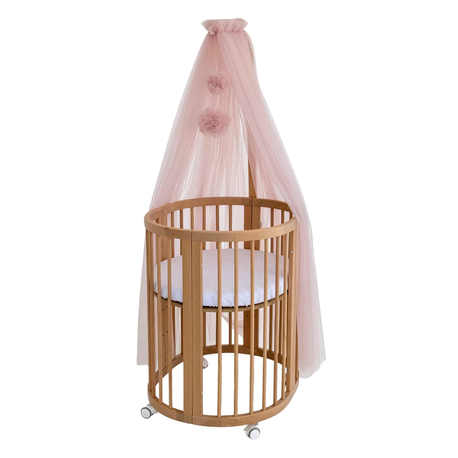 Ein Baldachin mit Pompons für einen Marken-Holzständer.